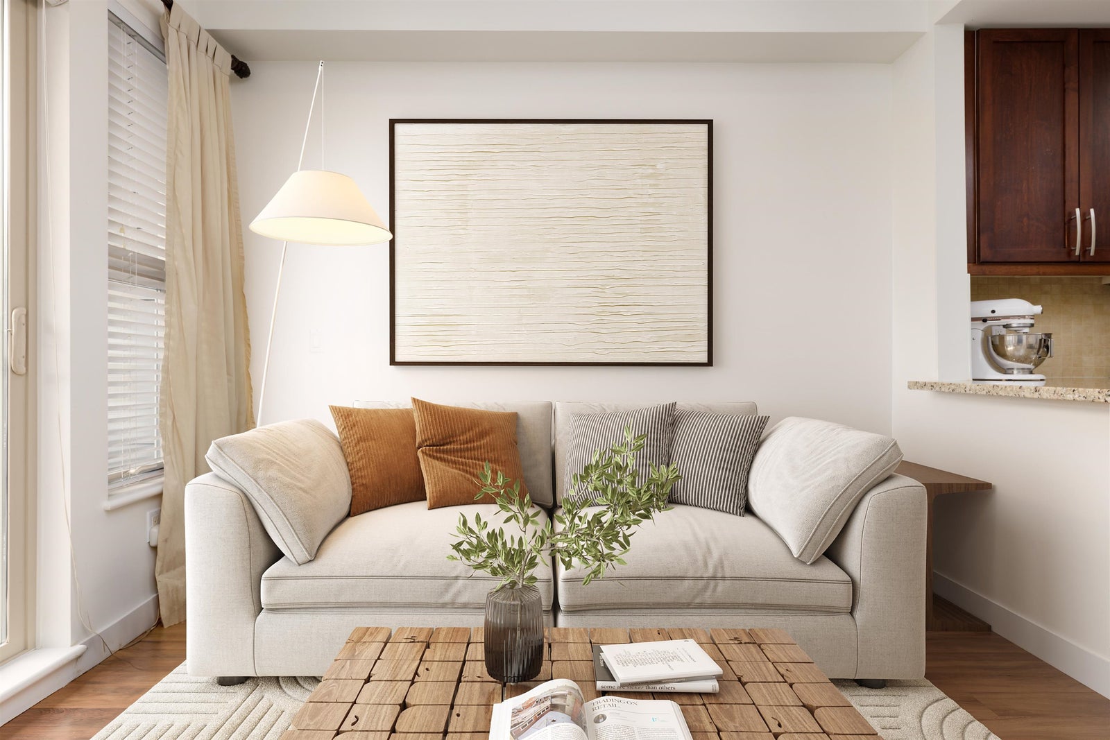 A cozy fireplace and bright, welcoming living space greet you as you enter, while the open kitchen and sitting area with private patio access make for great entertaining, summer bbq’s or quiet mornings with a coffee.